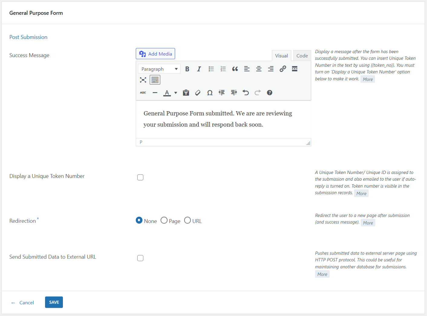 The primary field allows you to write a success message inside the input box. This is the message which users will see upon successful form submissions. You can even add media files such as an image or video to decorate the success message. In this instance, we use “General Purpose Form submitted. We are are reviewing your submission and will respond back soon.” as the success message.