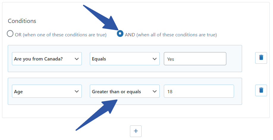 It is possible to have more than one fields affect the visibility behavior of a field. Let’s say we had another field in our form that asked for the user’s age. Now we want to show the “Driver License Field” if “Are you from Canada?” is “Yes” and age is 18 or more than it.