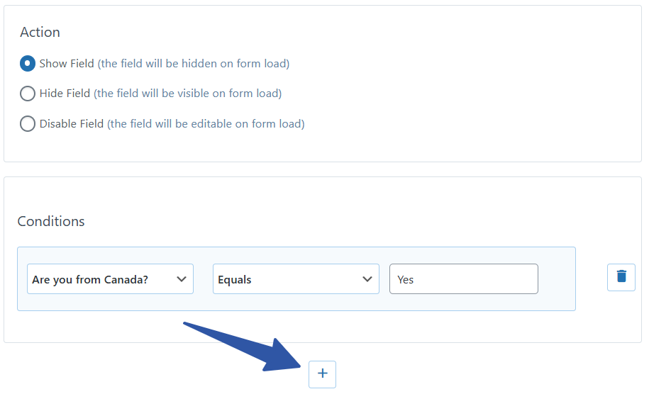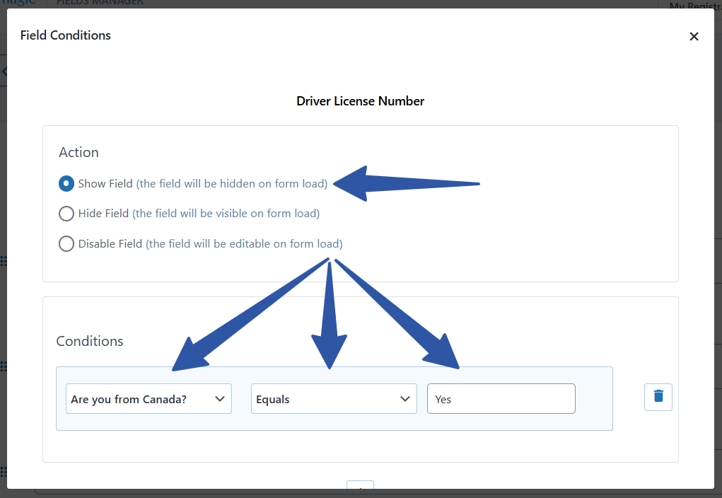 Clicking on the icon will open the “Conditions” configuration popup. From this popup, select the “Action” as “Show Field” and in the “Conditions” section select the field “Are you from Canada?” in the first drop-down. Navigate to the drop-down adjacent to it and select “Equals”. There is a field placed next to the drop-down which will accept the value for the condition to trigger. Fill it with the text “Yes”.