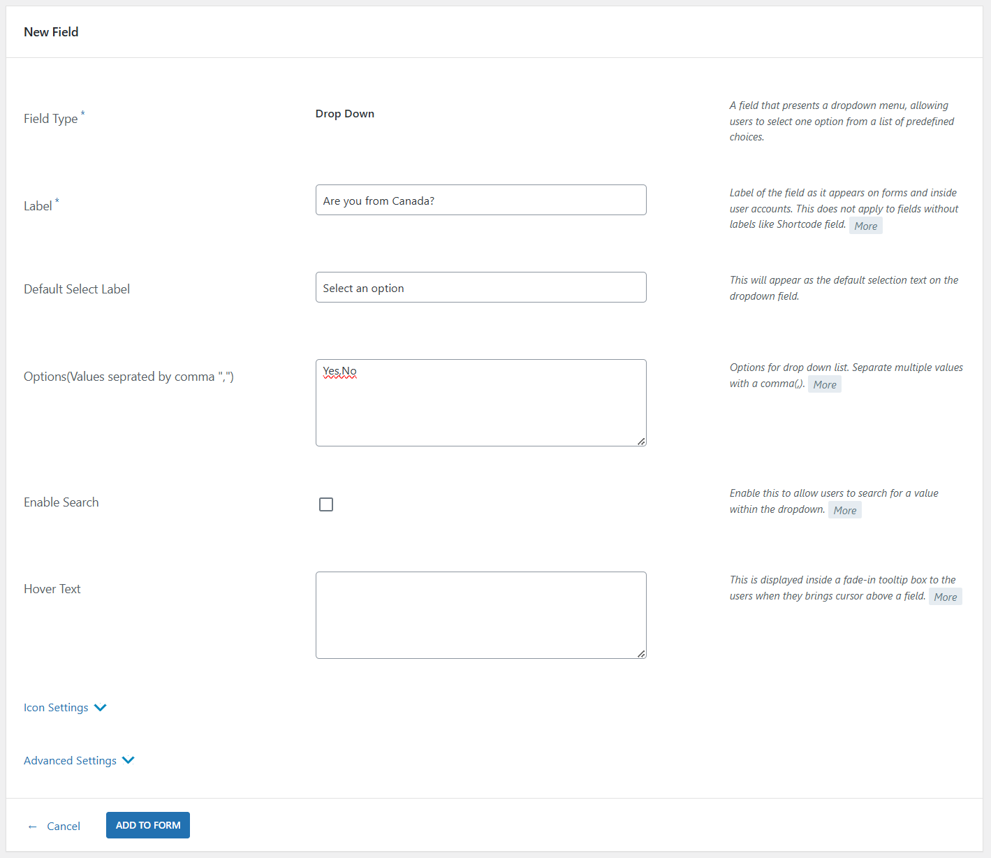 Add a “Drop Down” field from the “Add Field” option. Label the field stating “Are you from Canada?”. Next, add the number of options you want to your dropdown list. In this case, we add two values “Yes” and “No” separated by a comma.