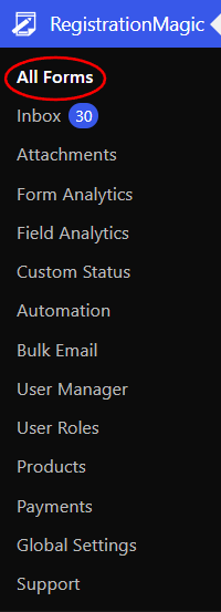 First, install the RegistrationMagic plugin from your WordPress Dashboard. Next, you will find the RegistrationMagic plugin menu. From there click on the All Forms link to land on the All Forms page.