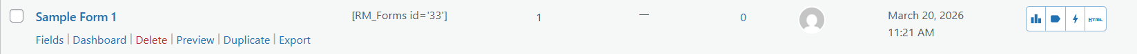 The All Forms page contains all the forms that you create through RegistrationMagic. Here, each form displays its unique shortcode and two useful links called Fields and Dashboard when you hover your cursor over it.