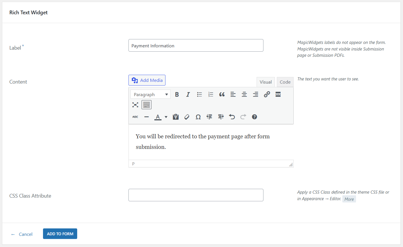 You can modify the text, insert paragraphs, add images, change fonts, alignment and even add media to it. You can also, apply HTML code to format the text from here. Then, you can also apply a custom CSS class defined in the Appearance section or the theme CSS file. Lastly, click on Add to Form button to finish your job.
