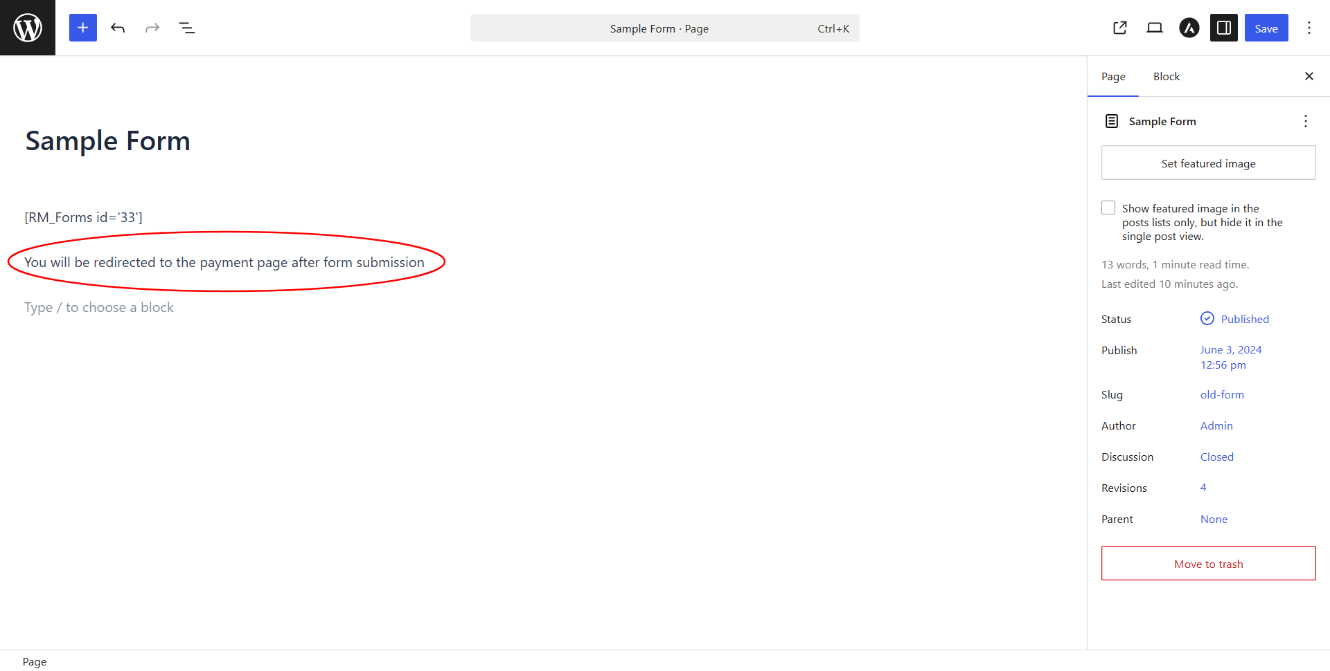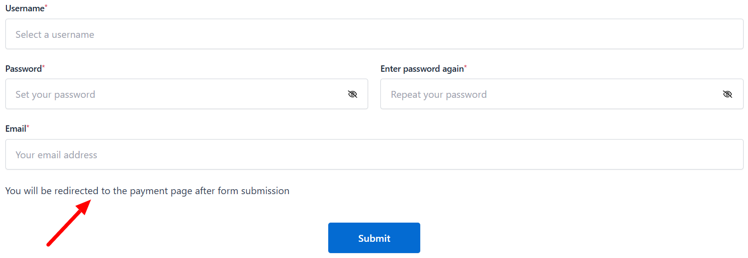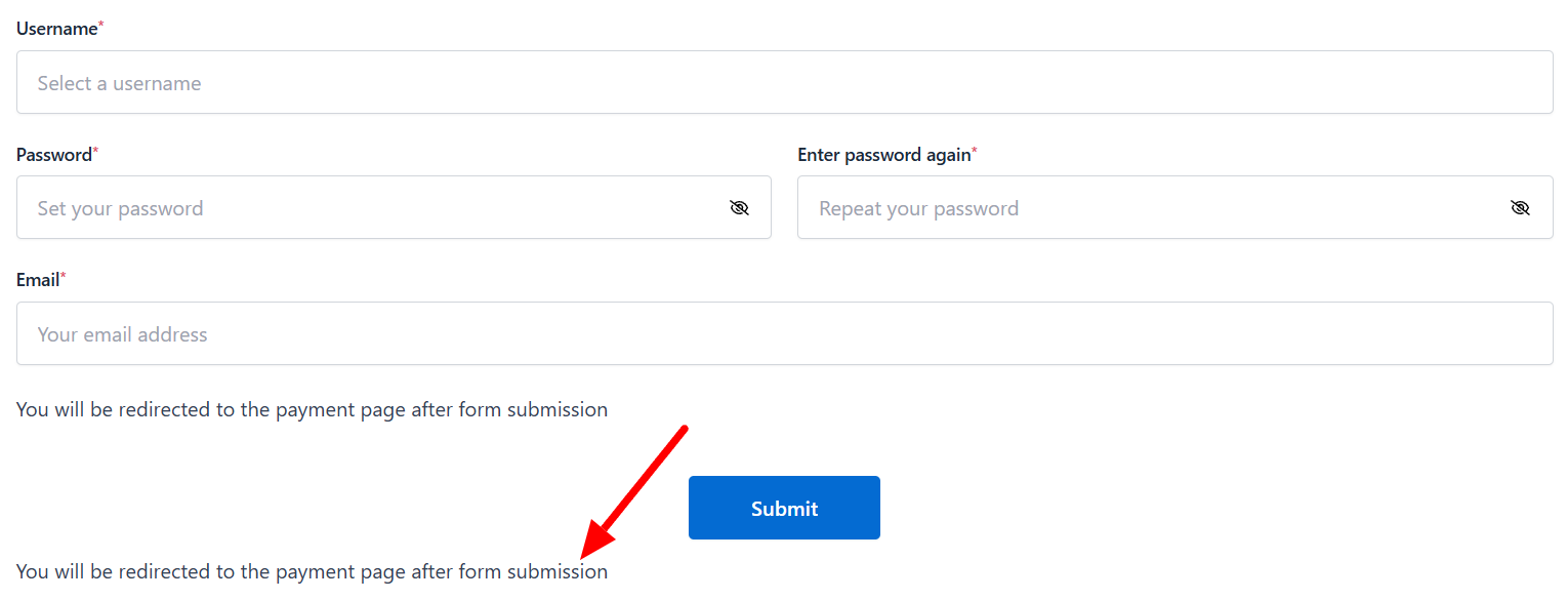 As an example, we will be using the following phrase: “You will be redirected to the payment page after form submission”. This phrase will be visible to the user as a constant text on the form.