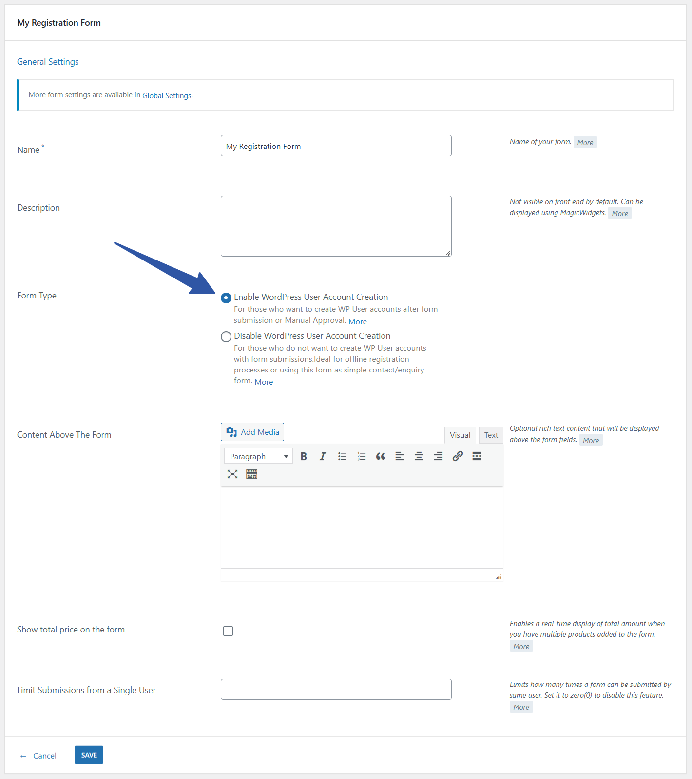 Also the form must be a WordPress user registration form. This is controlled from General Settings in the Form Dashboard.