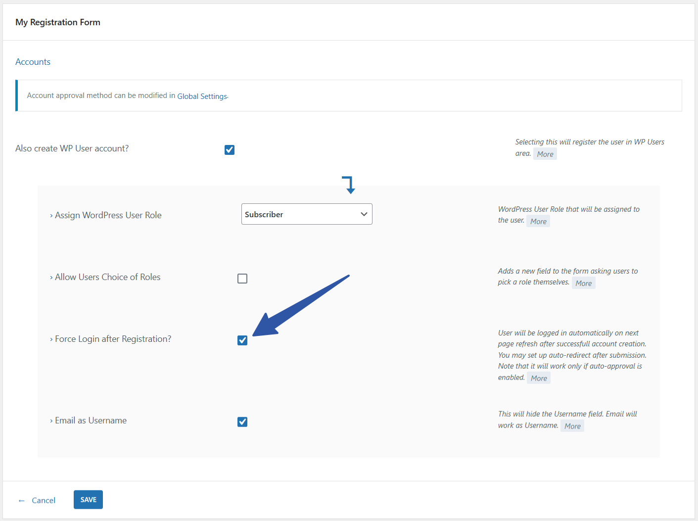 Let’s turn our setting on and check the Force Login after Registration? checkbox.