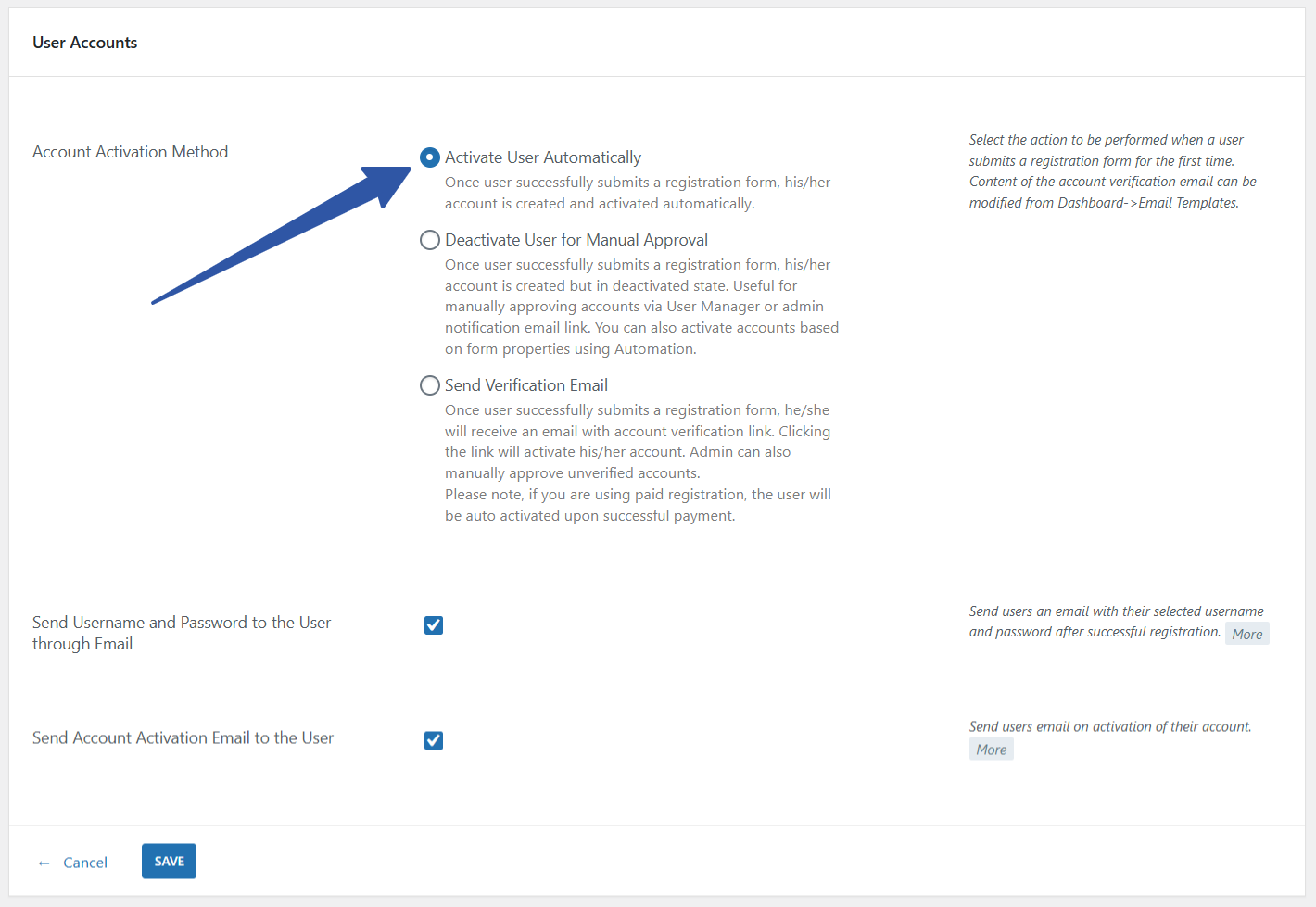 Obviously, for auto-login to work, you need to turn on user auto-approval. Auto-Approval is administered from Global Settings —> User accounts —> Account Activation Method selector.