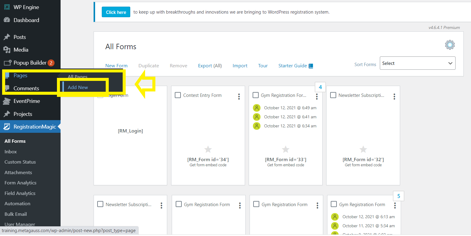 - First, click on the RegistrationMagic plugin and click on “All Forms“.