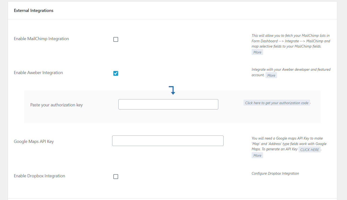 • Easy access to integration by entering the Aweber authorization key in External Integrations.