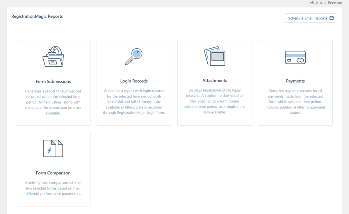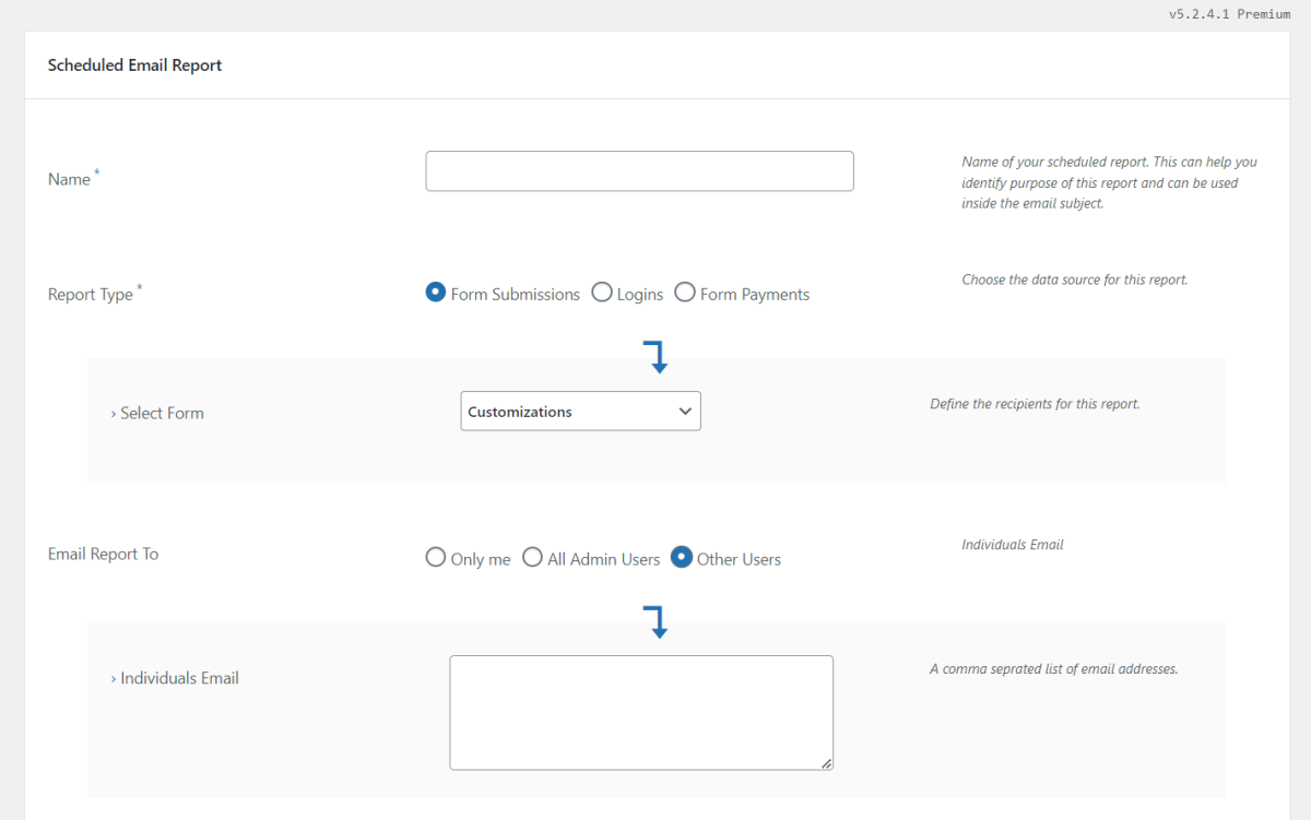 The email reports extension empowers users to schedule and personalize email reports. Navigate to email reports from the form analytics menu. Create a new report by accessing the menu and adjusting its settings. Name the scheduled report and choose its data source from options like Form Submissions, Logins, and Form Payments. Specify recipients using the “Email Report To” option, selecting from Only Me, All Admins, or Other Users. Set the frequency and initial report date and time. Manage scheduled email reports on the main page by deleting, enabling, or disabling them as needed.
