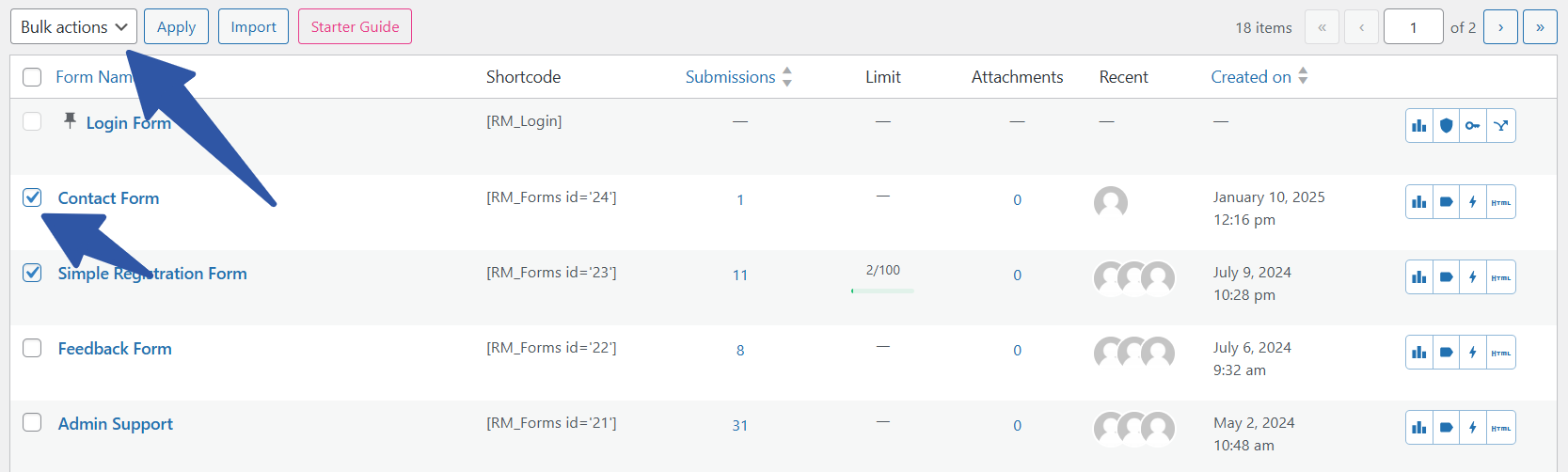 To download more than one form at once, just select the forms that you want to export by checking the checkboxes that are on the left of each form’s name. Once forms are selected, go to the Bulk Actions dropdown at the top. Select the Export option from it and click the Apply button.