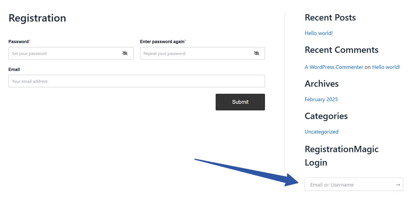 The “RegistrationMagic Login” widget is small and compact and works by asking for the username/email first and then shows the password field so that the widget doesn’t take up a lot of space.