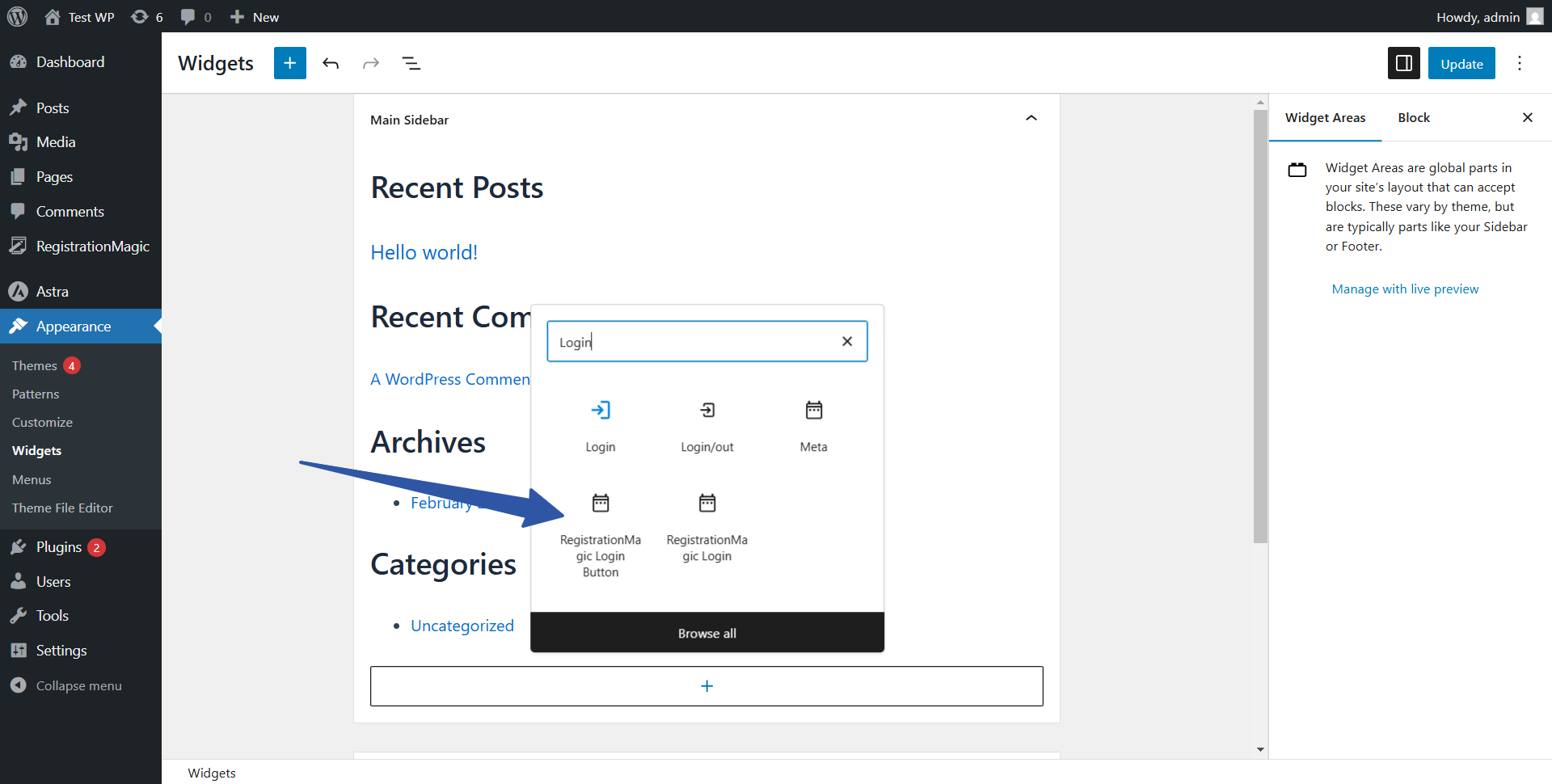 In addition to the “Login” widget, RegistrationMagic also offers the “Login Button” widget. You can follow the same process as before to locate the widget. Only this time, add the “Login Button” widget to your sidebar instead of the “Login” widget.