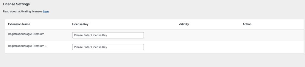 Go to the RegistrationMagic menu and select Global Settings to activate the license. On this page, go to the License tab. Enter the license key you acquired from the RegistrationMagic website for the extension you purchased in the License Settings. Following the addition of the key, you will notice a new button “Activate License”. When you click the button, the validity of the license key will be visible in the Validity column.
