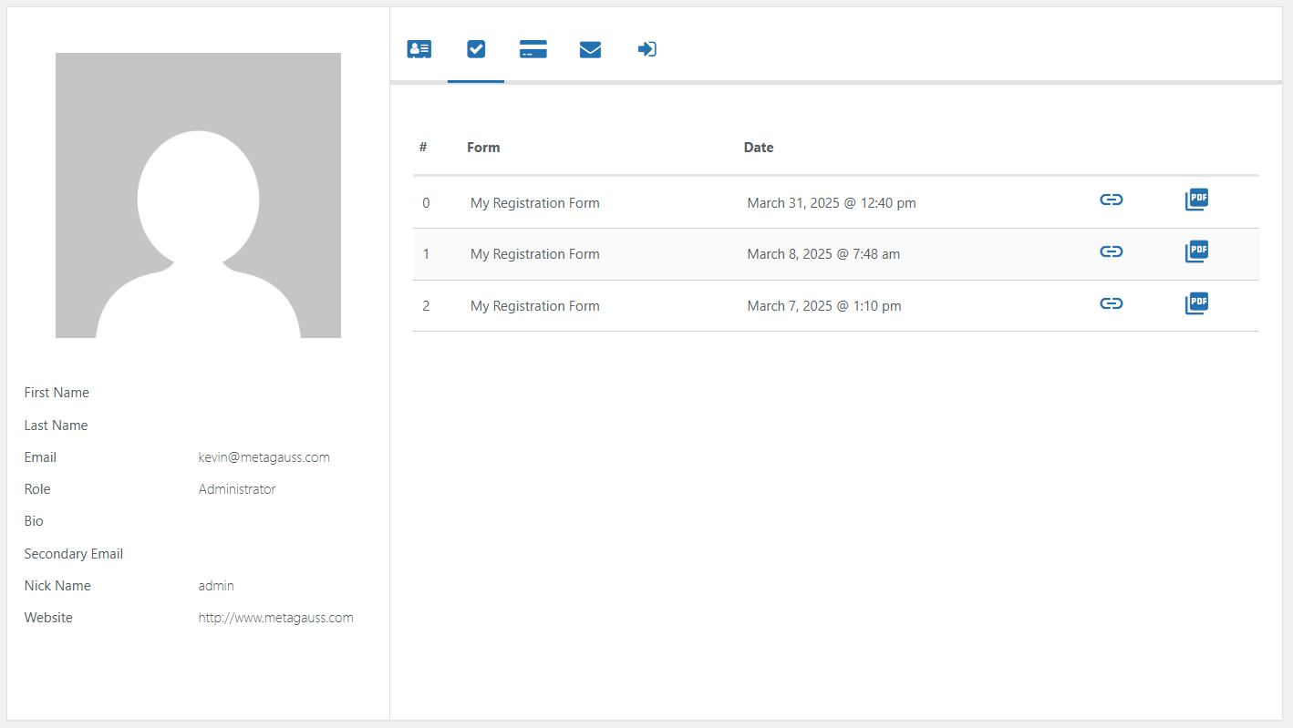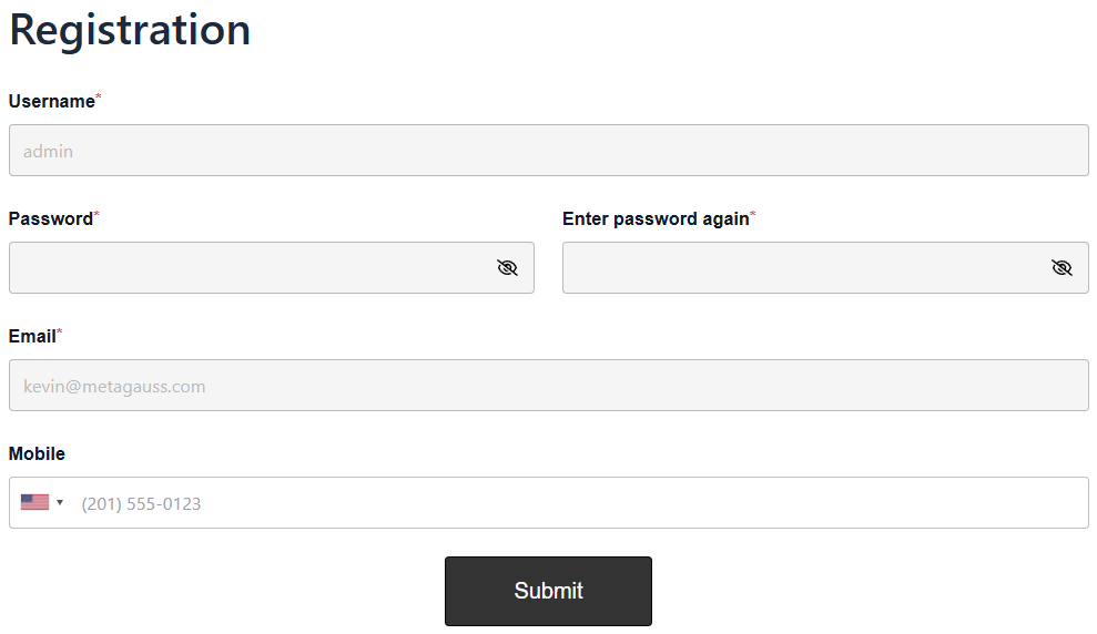 RegistrationMagic allows users to submit multiple registration forms using the same email address without additional configurations. When a logged-in user accesses a registration form, the Username and the Email fields are pre-filled with the user’s details while the Password fields are disabled. This streamlines the process, allowing users to submit multiple forms effortlessly.