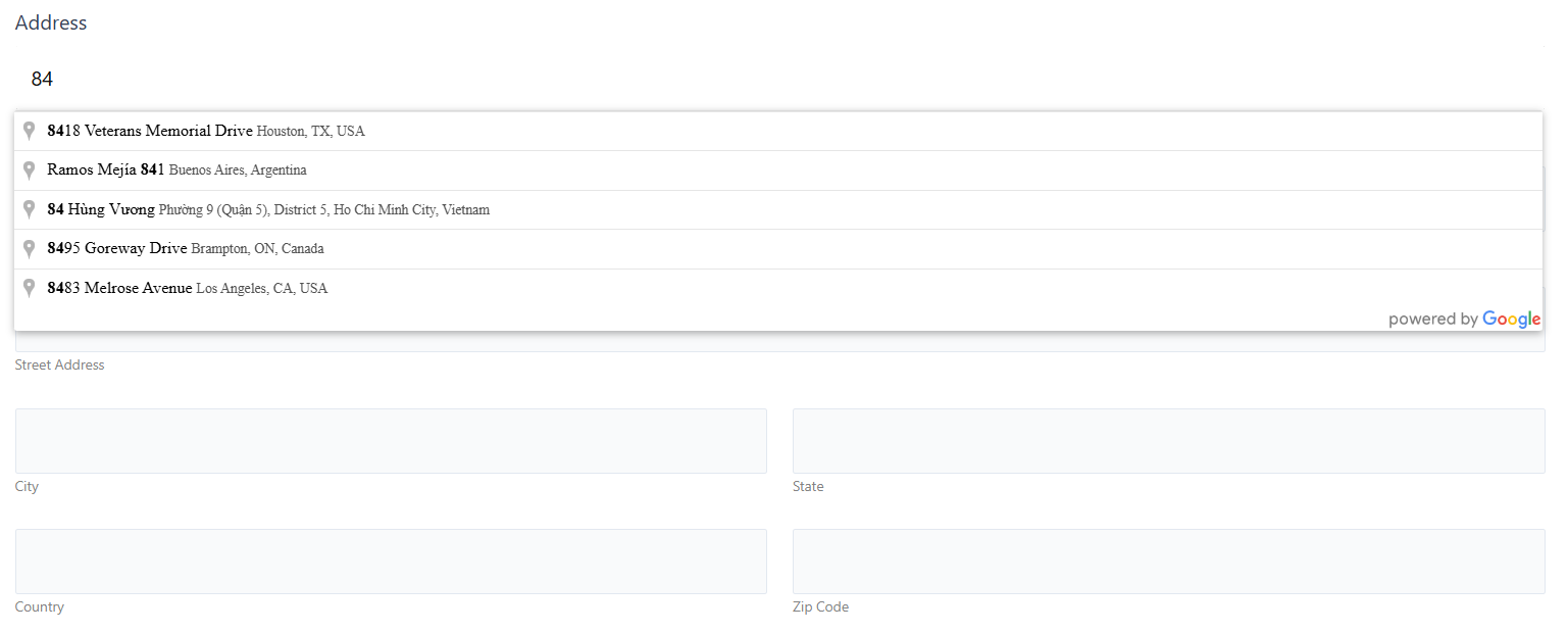 Autocomplete is ideally a feature which makes it non-troublesome for users while filling the address fields in a form. Customers can easily choose their address from the suggestions once they type their house name/street number in the address field. This feature can only be enabled if you have Google Maps API integrated from your Global Settings >> External Integrations settings.