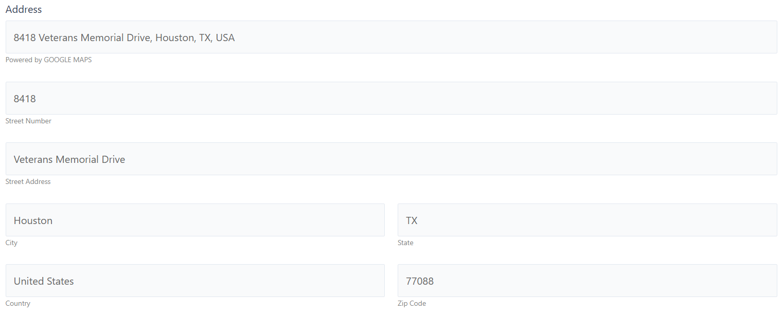Now when you select an address from the dropdown list, it’ll fill all the address fields automatically with the selected address from Google Maps.