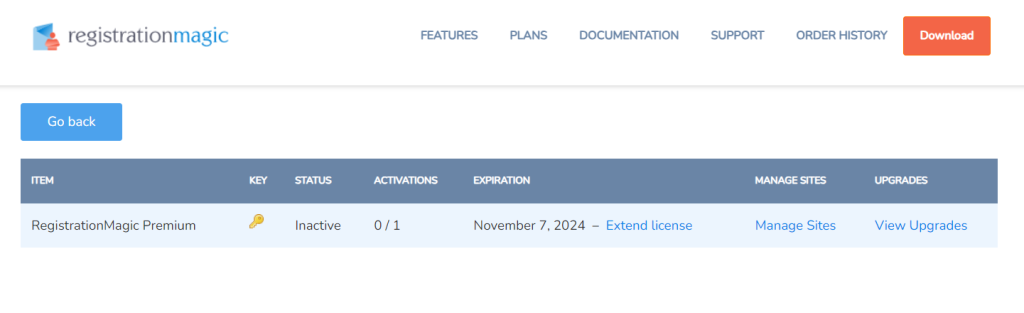 After logging in with your admin credentials on the RegistrationMagic website, proceed to the Order History page, which is accessible via the top menu, visually resembling this interface – a central hub for managing your licenses and renewals. Here, you’ll find a comprehensive overview of your order details and the option to initiate the renewal process effortlessly.
