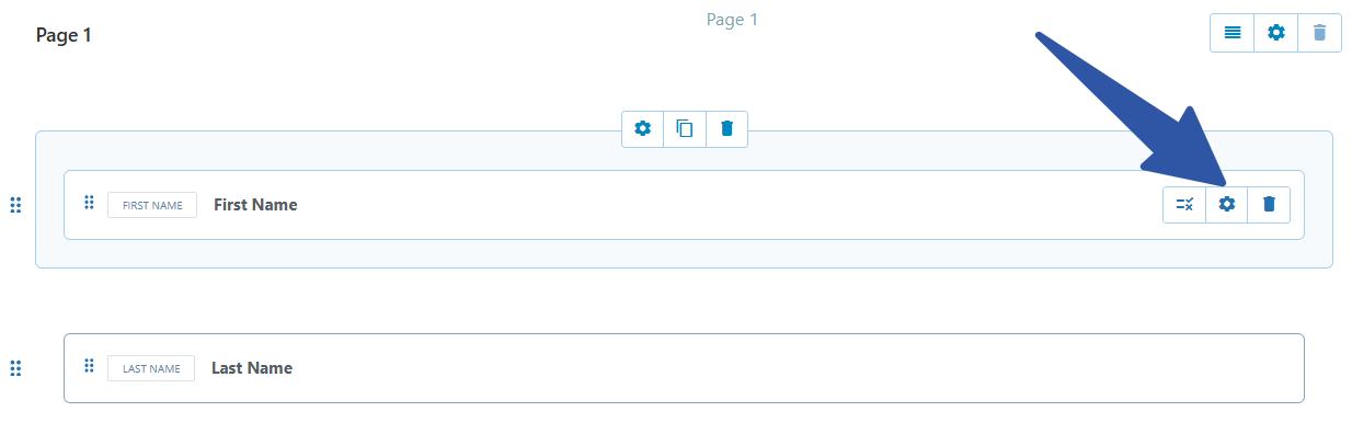Now, we need to make first two form fields required. For this, we’ll have to visit the field settings by clicking the cog icon that is visible when we hover cursor over the field.