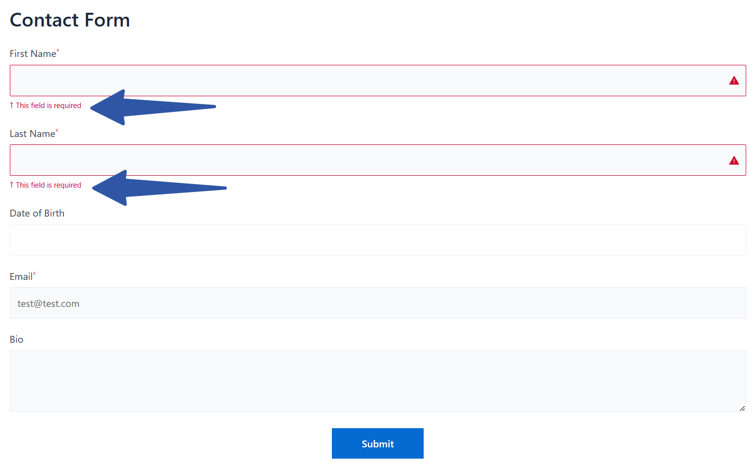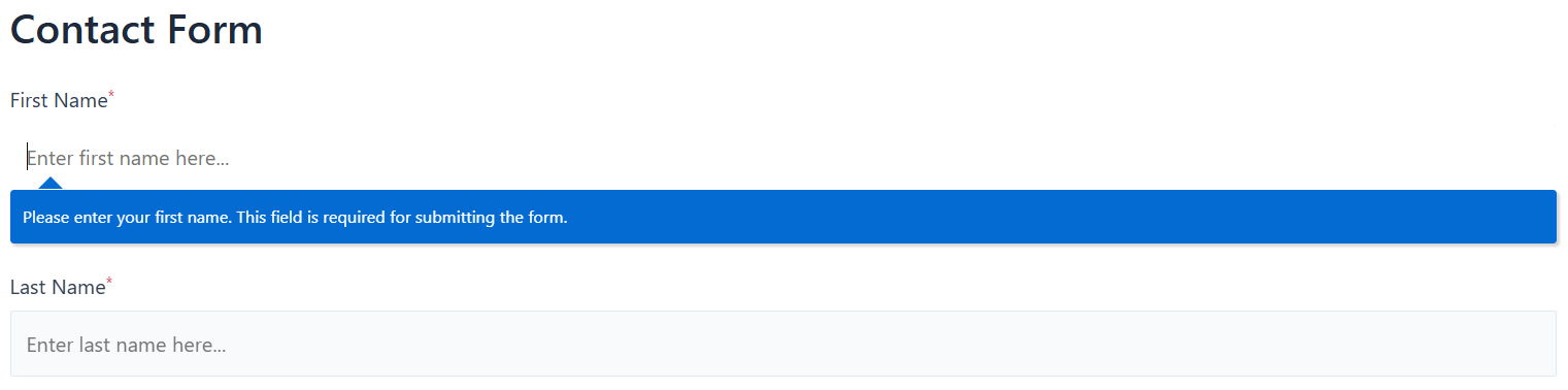As we can see, red asterisks appear before first the two field labels. This universally signifies a required field in a form. Next, let’s make sure they are doing exactly what they intend to do by trying to submit the form while keeping first two fields blank. Here’s what we’ve got: