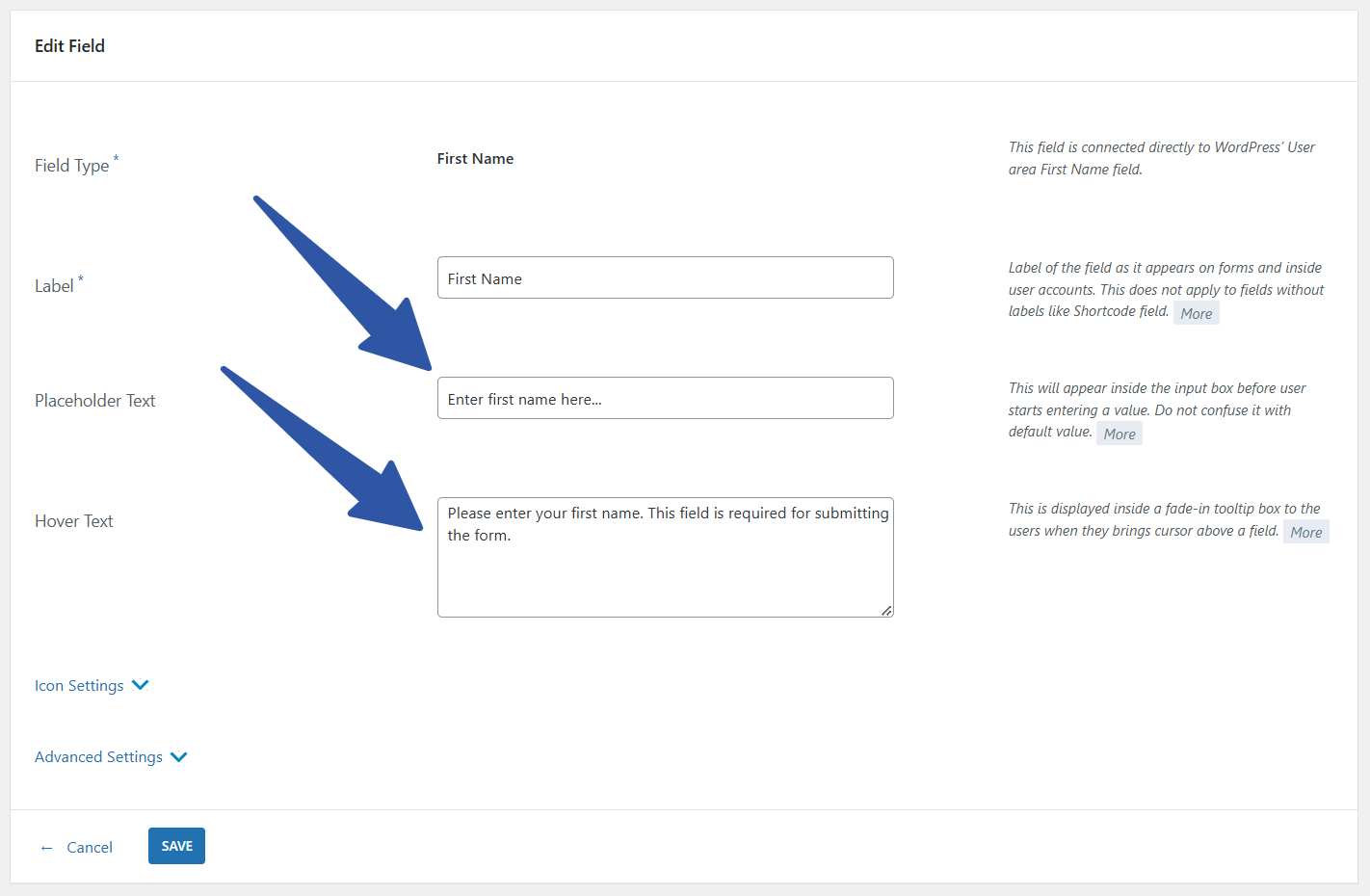 For this, we are going to do two things – 1. Add Placeholder Text & 2. Add Help Text to both the fields. We’ll go back to field settings to update them. Both settings are right below the field Label.