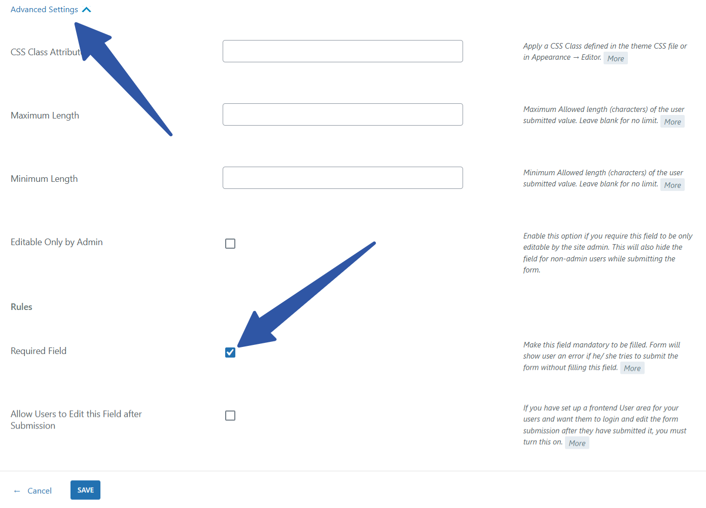 On the field settings page, click the “Advanced Settings” link to open the settings under it. At the bottom of it, you’ll find the setting section titled “Rules”. There’s a checkbox there with the label – “Required Field”. We need to check it and save the settings, and go on to repeat the process with the second field.